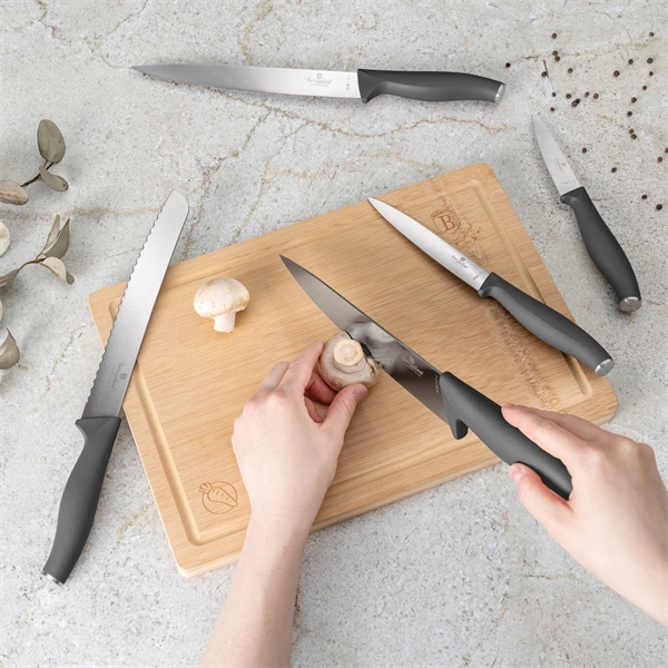 A Berlinger Haus BH/2961 bambusz vágódeszkával, matt antracit 6 részes késkészlet egy prémium minőségű készlet, amely a matt antracit szín és a 3cr13 rozsdamentes acél kombinációjával nemcsak eleganciát, hanem hosszú távú használhatóságot is biztosít.
