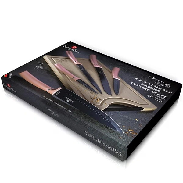 A Berlinger Haus BH/2554A egy 6 részes késkészlet bambusz vágódeszkával, amely a pink színvilággal van ellátva. Az eszközök prémium minőségű rozsdamentes acélból készültek, és tapadásmentes fekete bevonattal rendelkeznek, ami megkönnyíti a tisztítást és használatot.