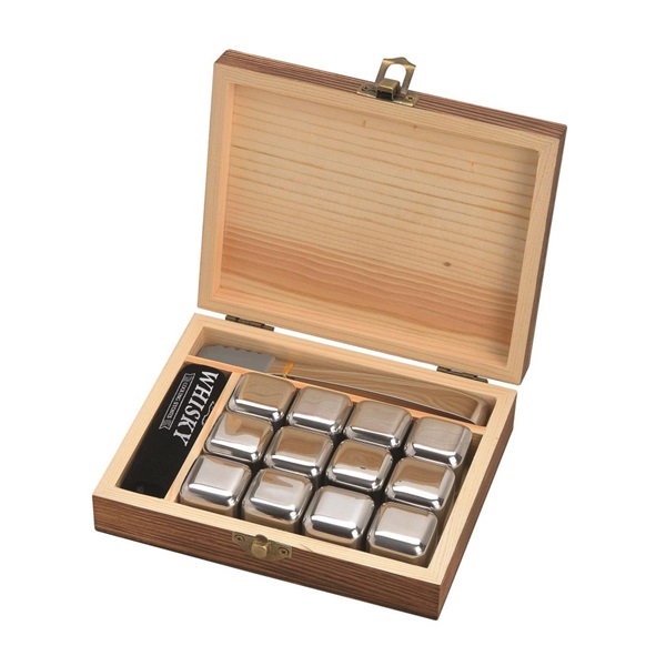 WoMa fekete bársonyzacskóval és csipesszel 12 db-os rozsdamentes acél whisky jégkocka készlet fadobozban
