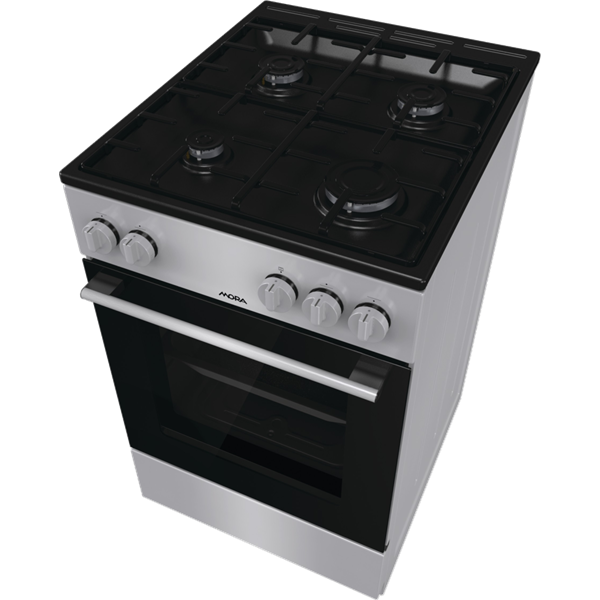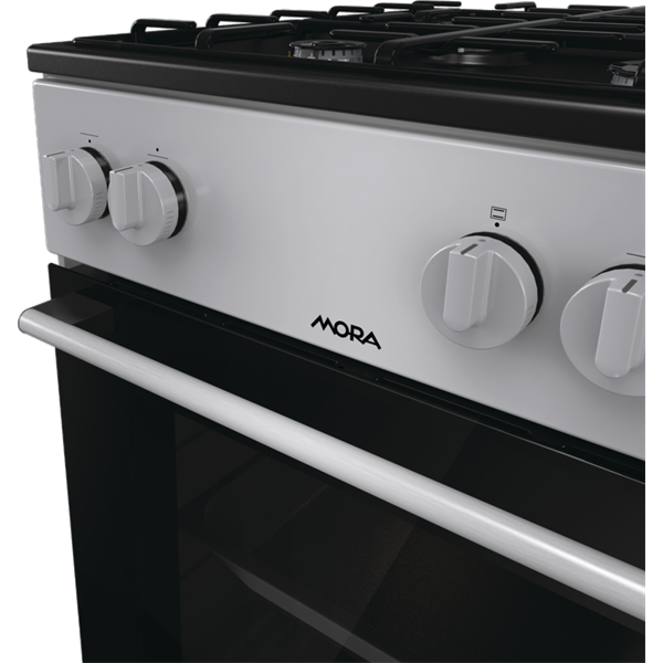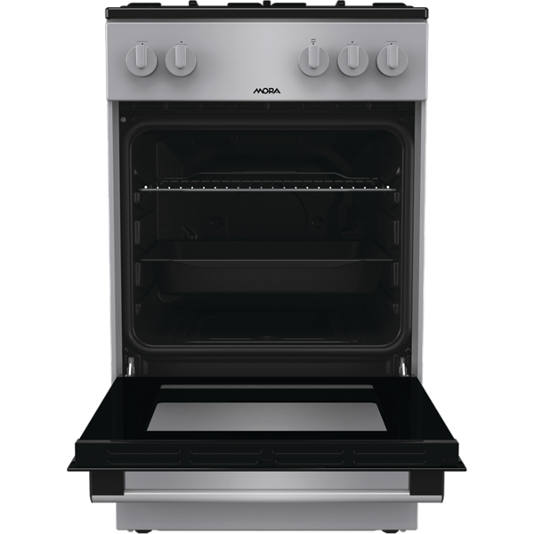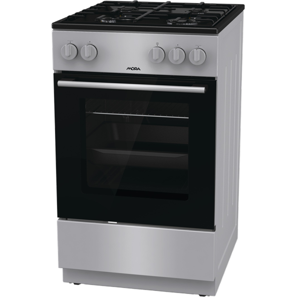 MORA GÁZTŰZHELY, 4 gázégő, Kamra űrtartalma: 70l, méretek: (Ma x Szé x Mé) 85x50x59,4cm, "A" energiaosztály, max. hőmérséklet 335°C, dupla üvegezésű ajtó, égésbiztosító, tartozék: sütőrács, lapos tepsi, alap zománcozott edénytartó rács, tető nélkül, szürke szín