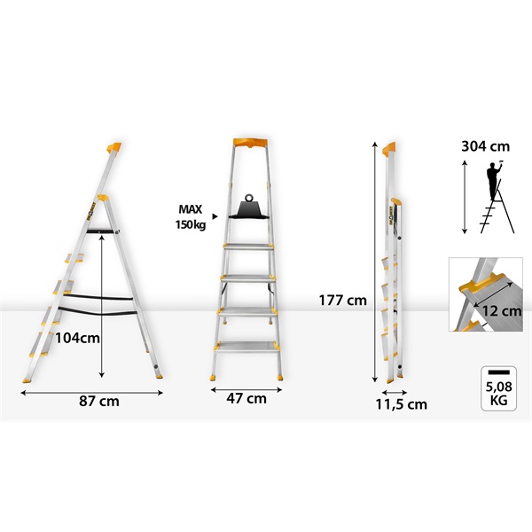 | Név | 5 fokos egyszemélyes alumínium létra – 150 kg |