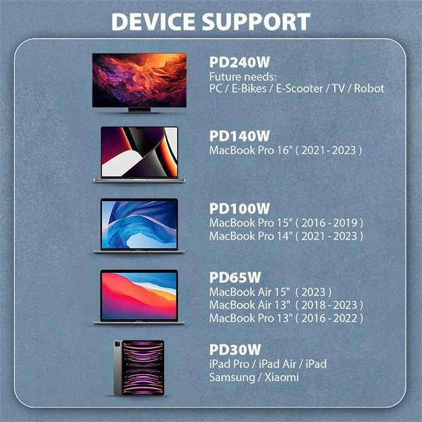 A kábel kompatibilis a Quick Charge, a PPS, a Samsung AFC és az SFC, az Apple, a SMART és más töltési technológiákkal.