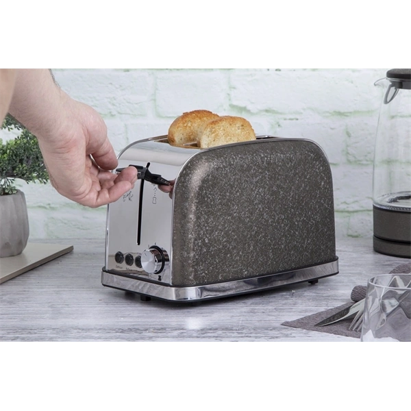 A kenyérpirító rozsdamentes acél borítással készült, amely biztosítja a hosszú élettartamot és a könnyű tisztíthatóságot. A 220-240V 50/60Hz 750-850W teljesítmény garantálja a gyors és hatékony pirítást.